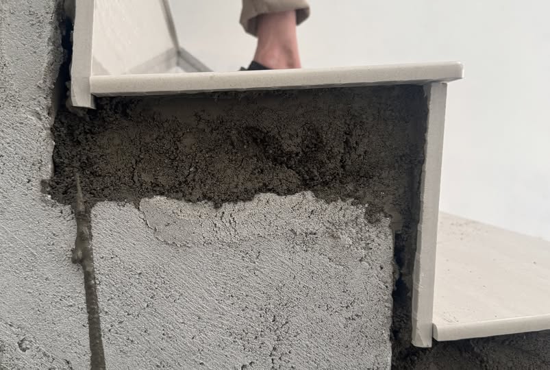 [工程項目] 樓梯磚黏貼 樓梯磚在黏貼時, 腳會踩的踏板水平不是完全平的,而是略帶一點傾斜。 靠近外側的位置會微微翹起, 這樣的設計能讓人在上下樓時重心更穩,也更安全。 這是施工中的一點細節, 卻能換來日後的安心。